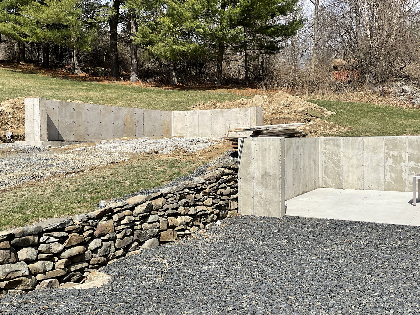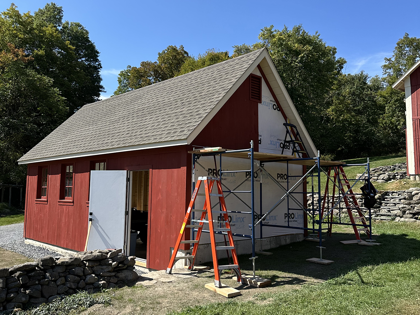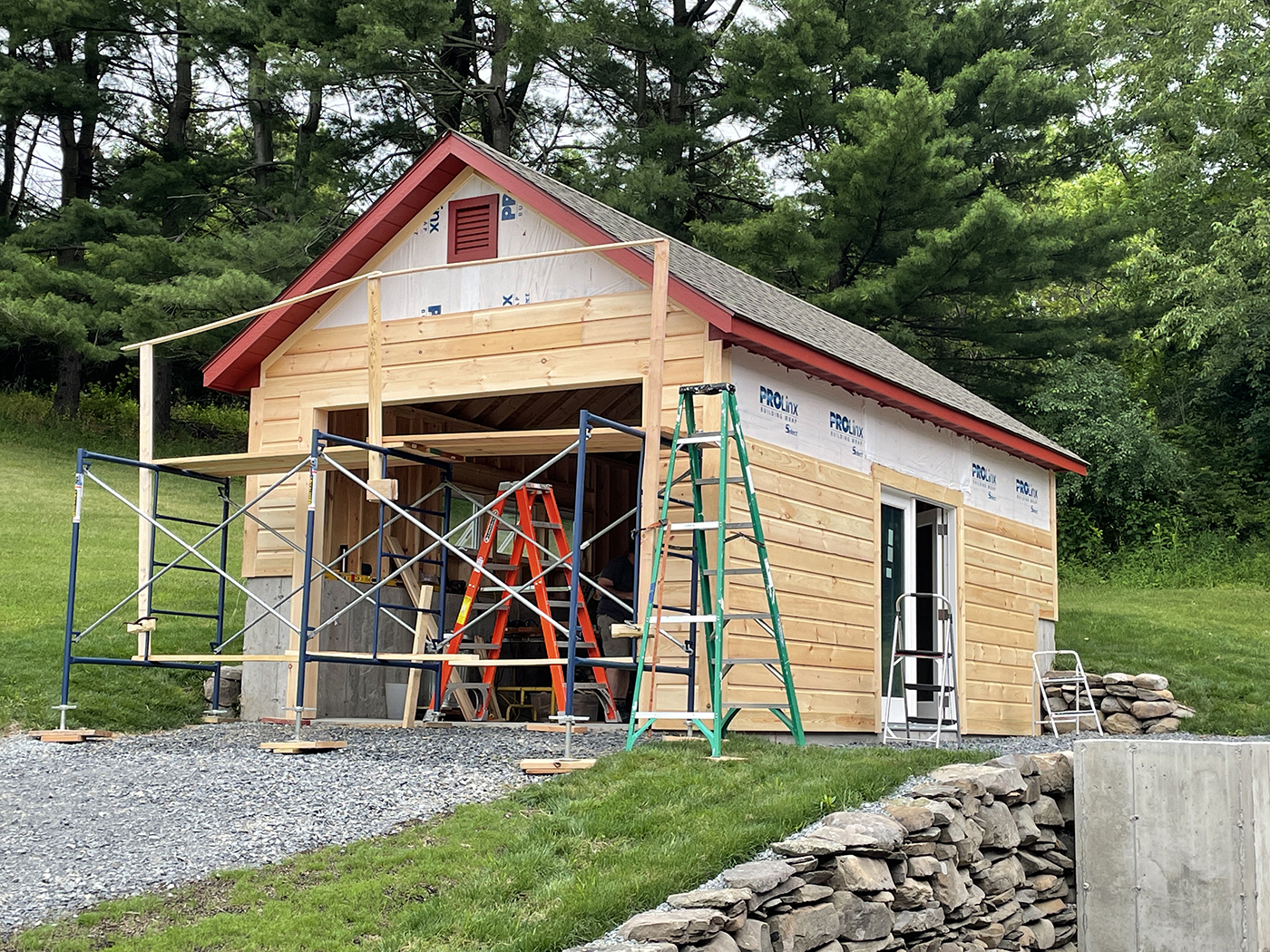 In 2015, about one third of the barn was still unfinished, allowing us (with the help of Brian's son, Tyler) to rebuild the space into a sculpture studio for Brian. A welding shed and garage would follow as well as updates to existing buildings for additional storage. We did extensive excavation and added new retaining walls to accomodate the new structures. The property is now filled with Brian's sculptures.